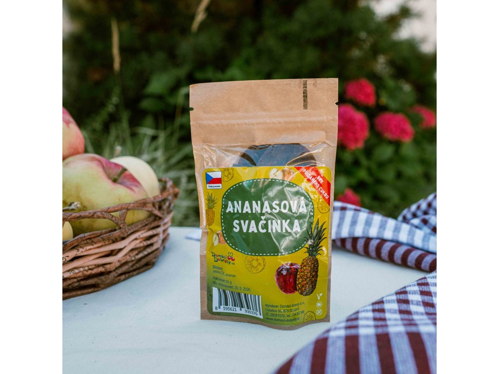 Další v řadě našich ovocných svačinek. Zde jsme spojili jablečné pyré a ananasové pyré. Společně perfektně zafungovaly. Jablko má dost pektinu a vlákniny, takže plátky drží pěkně tvar. Ananas sladkému jablku dodal svou pikantní chuť, která vynikne při mlsání na konci, ale je příjemně ananasová.