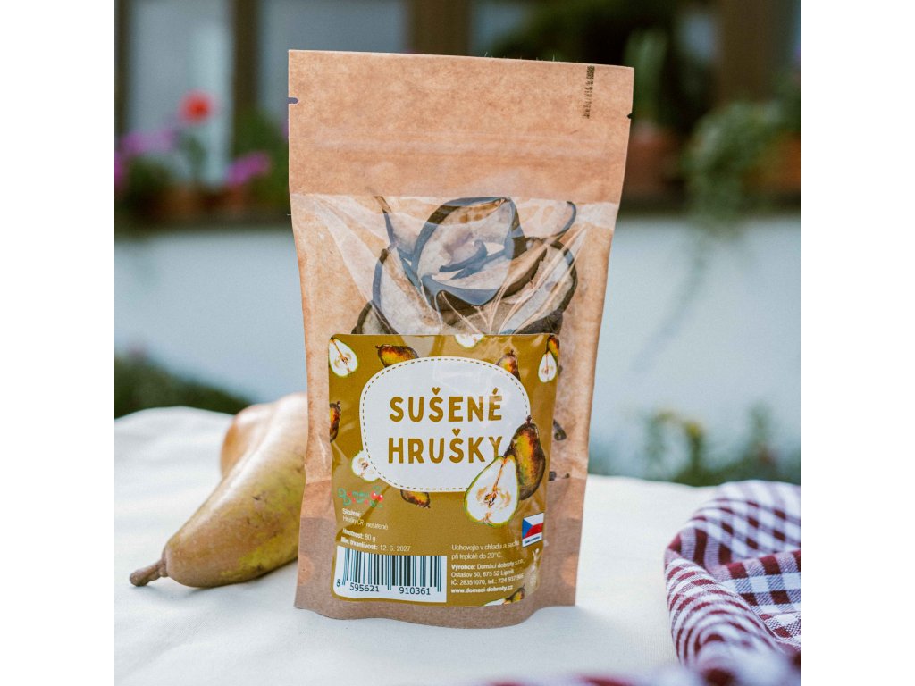 Hrušky obsahují obdobné množství cukrů jako jablka, ale výrazně méně kyselin. Proto se nám zdají sladší. Hrušky jsou cenným zdrojem kyseliny listové (vitamín B9), která hraje významnou roli při krvetvorbě. Z minerálních látek obsahují hodně draslíku a jsou poměrně bohaté na zinek. Působí močopudně a jsou doporučovány při chorobách krevního oběhu a ledvin. My sušíme dobře zralé hrušky, aby zůstaly měkké a chutné. Protože nejsou sířené, po usušení ztmavnou. Naše zákaznice je často vyhledávají k přípravě náplní do koláčů tzv. frgálů a k vaření ovocných tradičních omáček třeba o Vánocích.