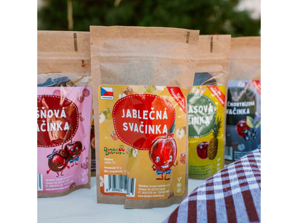 Jablečná svačinka je pouze z jablek. Jablka mají tu vlastnost, že obsahují vlákninu a pektin, takže hmota drží dobře pohromadě a po usušení je krásně hladká. Ovocní hadi jsou hnědí, protože jablka nejsou sířená a po zpracování ztmavnou. Plátků je v balení 5-7 kusů