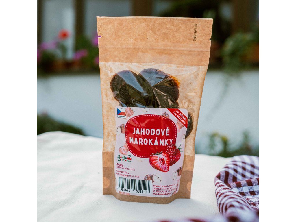 Jablečné marokánky jsme doplnili o jahody. Jablečné pyré je dochuceno jahodou a usušeno do placiček. Tyto jablečné marokánky jsou sladší a moc dobré.