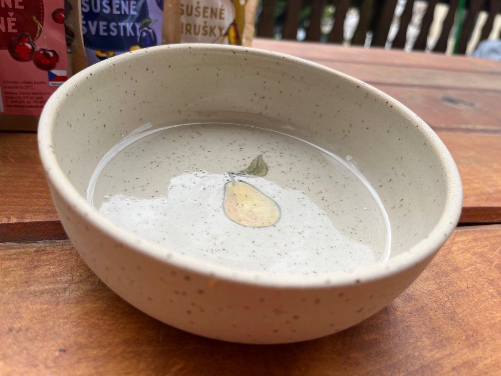 Keramická miska se sušeným ovocem vznikla propojením dvou malovýrobkyň.