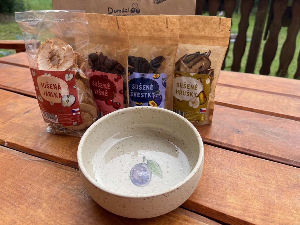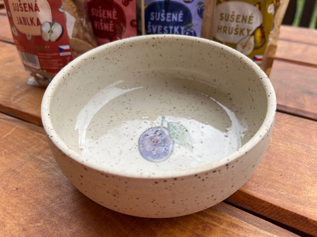 Keramická miska se sušeným ovocem vznikla propojením dvou malovýrobkyň.