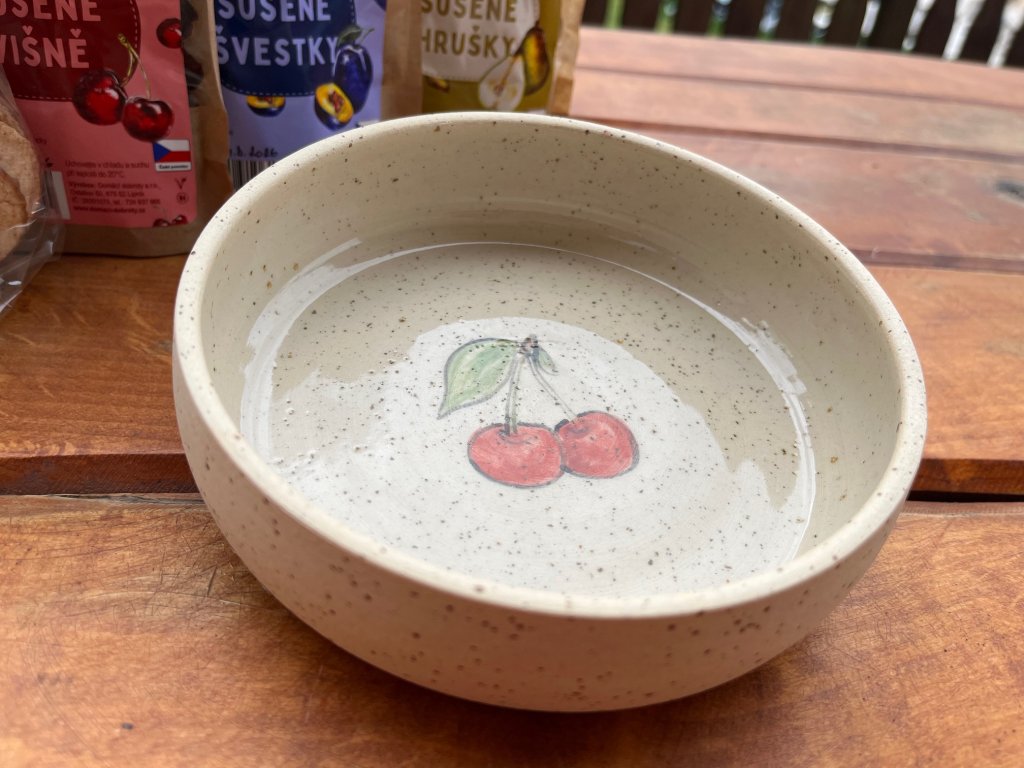 Keramická miska se sušeným ovocem vznikla propojením dvou malovýrobkyň.