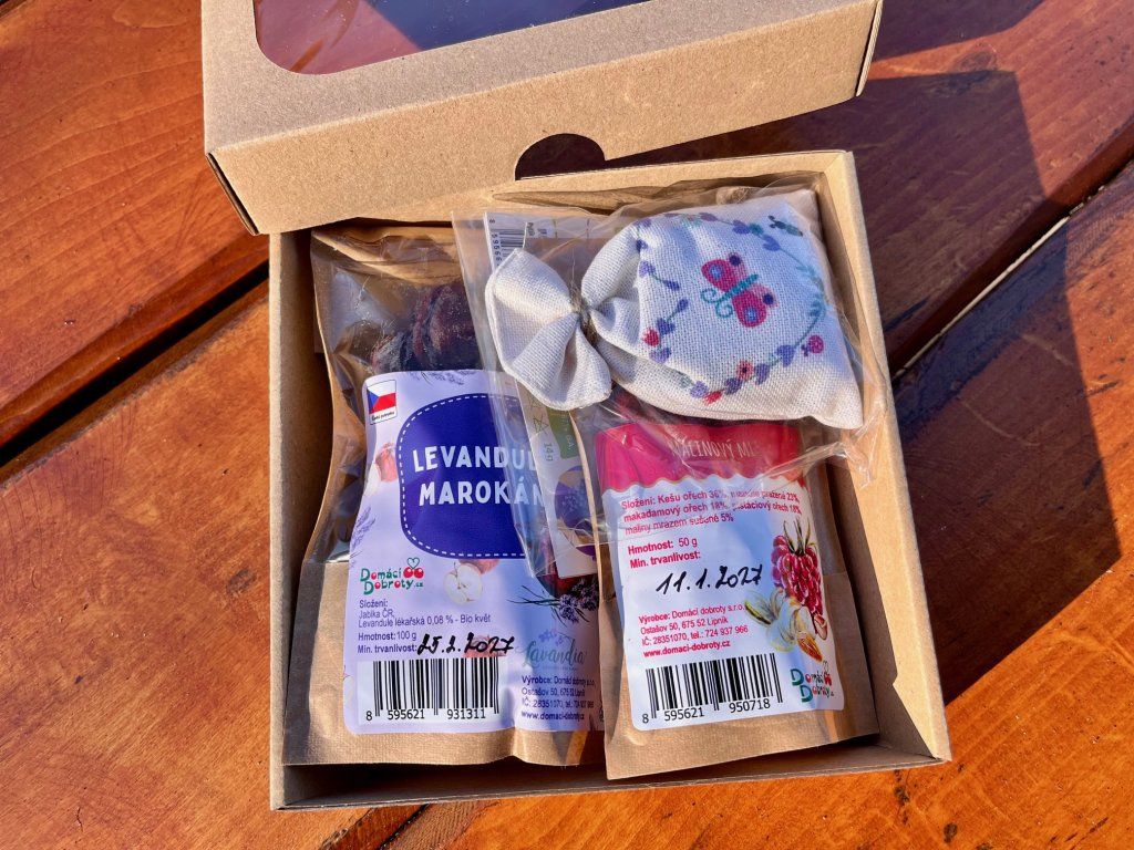 Levandulová krabička vznikla spojením výrobků dvou malých moravských firem, které spolupracují. Domácí dobroty vyrábí jablečné marokánky s levandulí, která pochází z pole levandulové farmy Lavandila s.r.o. Starovičky pod pálavskými vrchy. Levandulová farma zase vyrábí krásné vonné sáčky s levandulí.