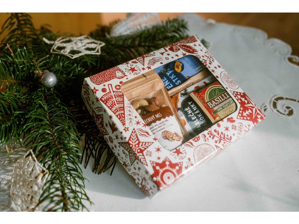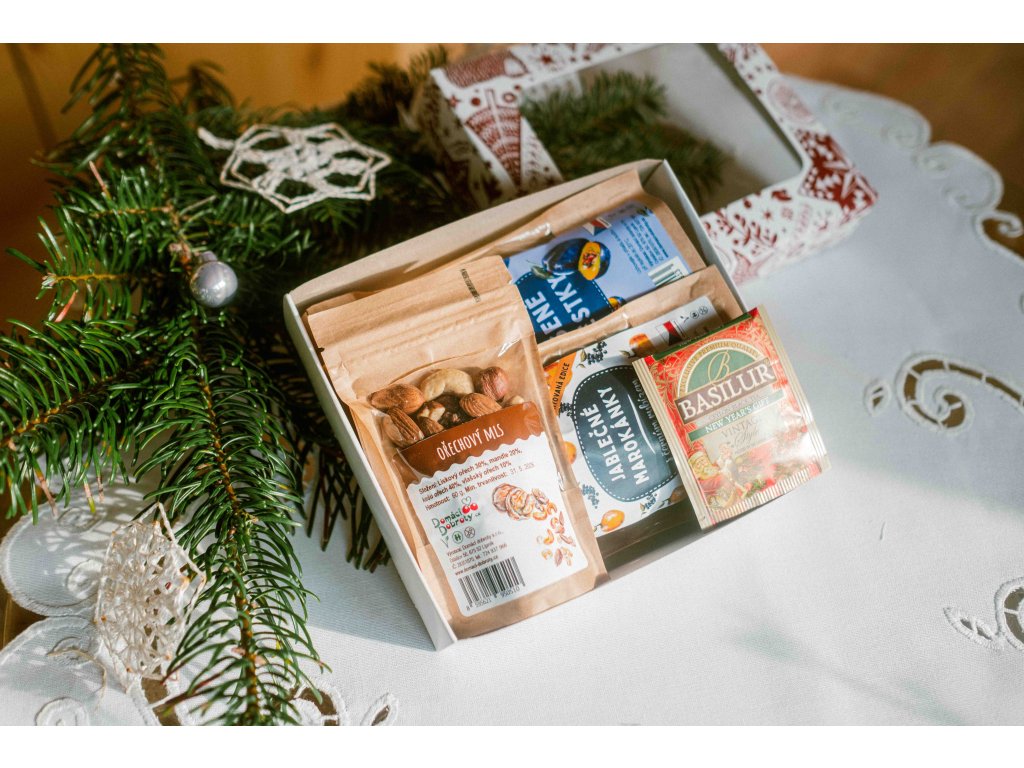 V krásné bíločervené krabičce s motivy vystřihovánek od známé české autorky Kornelie Němečkové najdete hned několik dobrot od fy Domácí dobroty. Můžete si k nim uvařit šálek lahodného čaje a zažijete pravou českou atmosféru Vánoc.