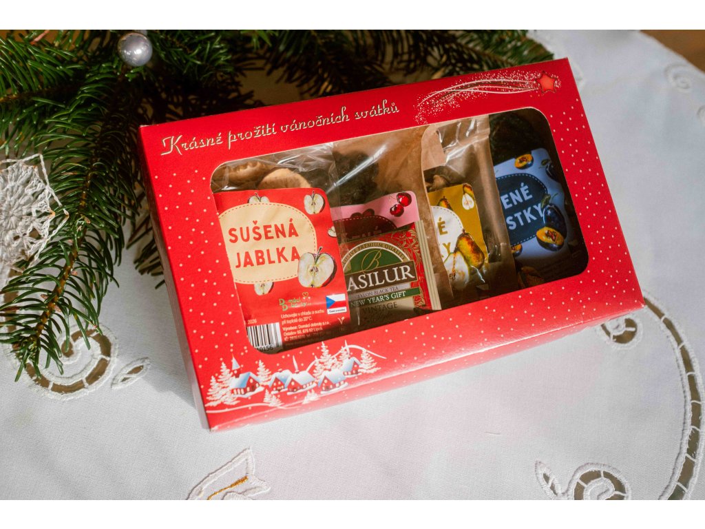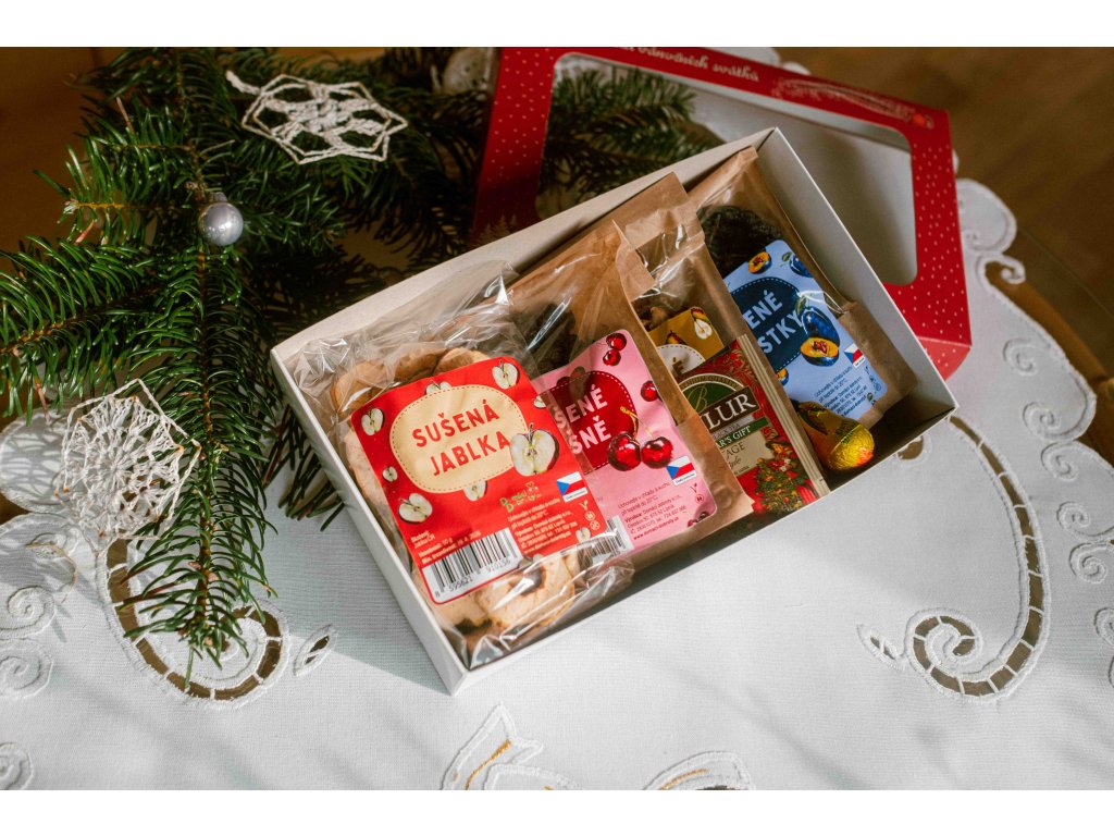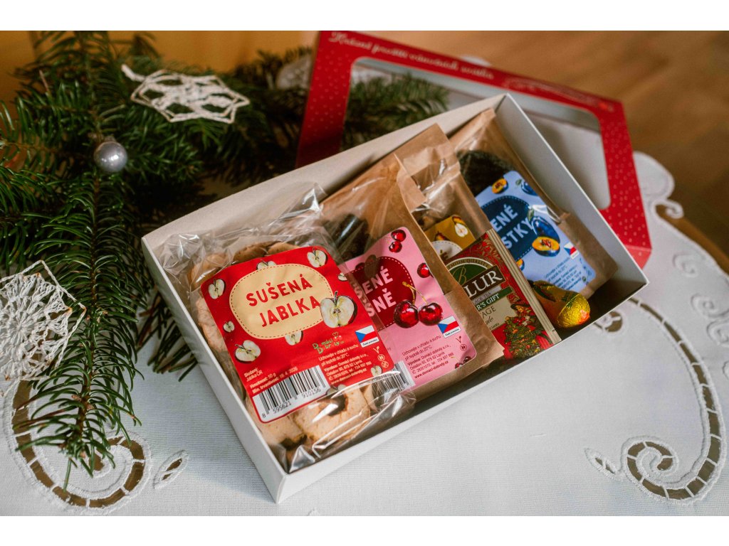 V krásné červené krabičce najdete hned několik dobrot od fy Domácí dobroty. Můžete si k nim uvařit šálek lahodného čaje a spolu s čokoládou od fy CARLA tak zažijete pravou českou atmosféru Vánoc.